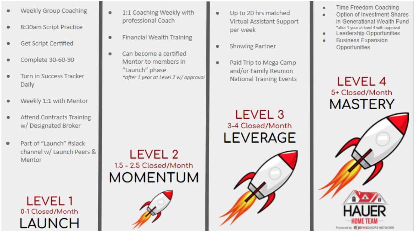 When you join us, your path to success starts right away. The onboarding process starts with a meeting to discuss expectations and standards. Then we’ll put you into our 90-day launch program where we’ll teach you systems, scripts, have daily check-ins, and bi-weekly team prospecting sessions. There are checklists for each week and each month to keep you on pace to accomplish your goals. We’ll get you up to speed quickly and get you into production.